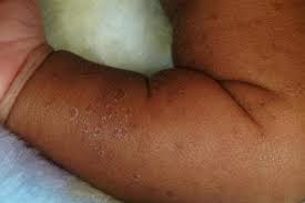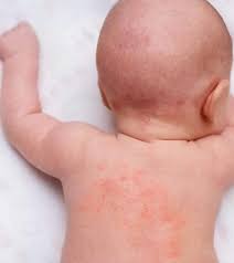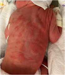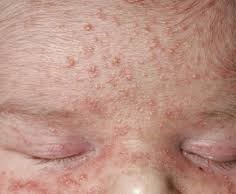 تبدأ بالظهور خلال ثلاثة إلى خمسة أيام بعد الولادة على شكل نقاط حمراء صغيرة تنتشر على الصدر والظهر والوجه والذراعين. وهذا رد فعل طبيعي في جلد الطفل، ويختفي مع مرور الوقت دون علاج.